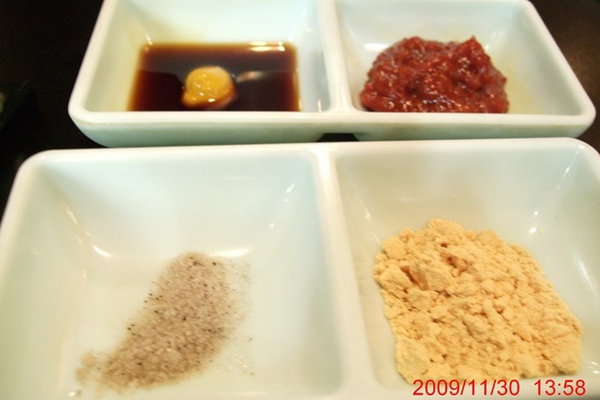 特別的醬料 左上那個超好吃!!! 右下是花生粉 XD