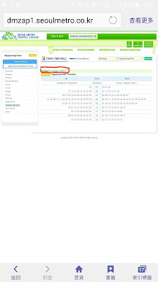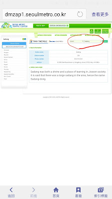 十月底趁著連假利用里程兌換機票 去了一趟韓國為了一直掛在嘴邊的楓葉季不過如同韓國氣象廳預測的 今年楓紅的晚即使都走到了全羅北道的內藏山 大概也只開了三成但因為除了楓紅 這次去的另一個理由是去燙頭髮 XDD所以也無法再更晚 這趟去的其中一天 到狎鷗亭找認識的bar tender於是碰到了需要用手機查詢末班地鐵的情況然後發現大部分的網頁都無法用手機開啟 冏 因為是flash做的路線圖的樣子所以想來分享一下 試了半天才找到的網站http://dmzap1.seoulmetro.co.kr/station/eng/stationinfo.action?eng=Y&stationId=0226&mainLine=2 示範: 從狎鷗亭站到弘大入口站首先要知道路線跟捷運方向可以用google或Daum map(現在好像改名KakaoMap) Google的畫面